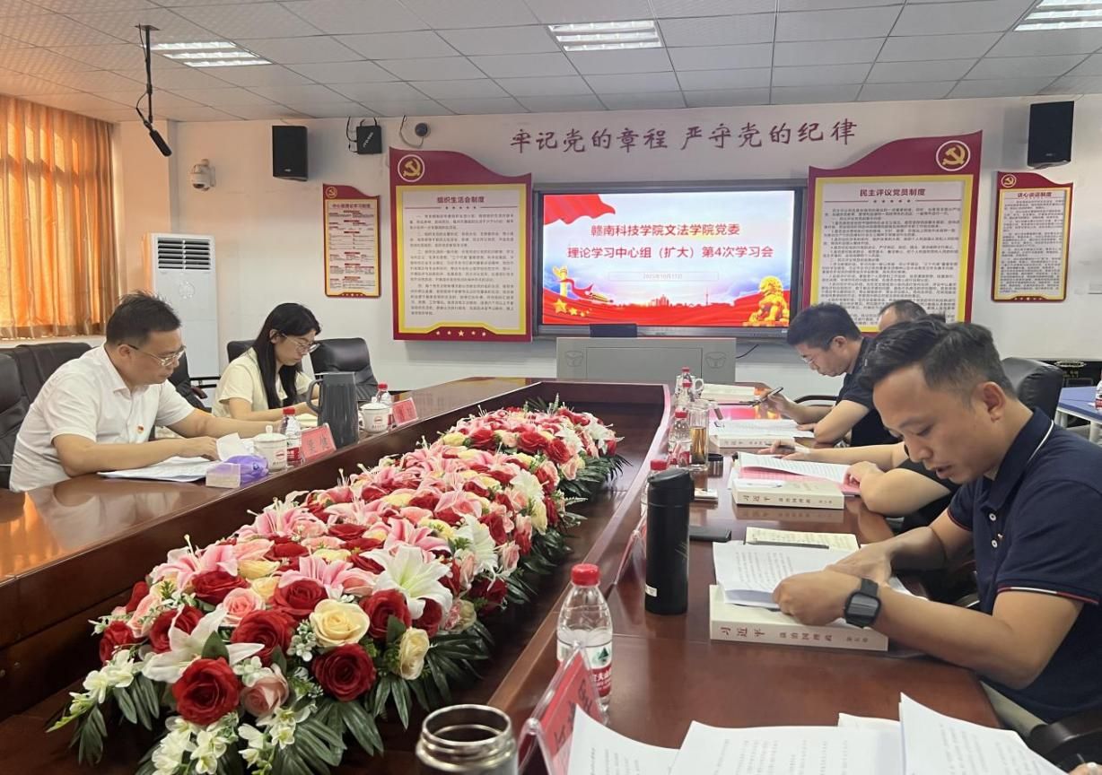 2025年10月17日下午,文法学院党委在明德楼1201会议室召开理论学习中心组(扩大)第4次学习会,深入学习习近平总书记关于全面从严治党、党风廉政建设和反腐败斗争的重要论述,围绕“完整准确全面贯彻新发展理念,科学谋划学院‘十五五’发展”开展研讨交流。学院党委理论学习中心组成员、各党支部书记、党建组织员参加会议,马克思主义学院院长梁健等旁听组莅临指导。文法学院党委委员、副院长高健婕主持并讲话。