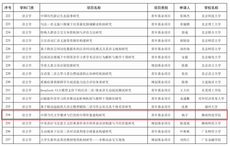 本网讯:9月25日,教育部社会科学司正式公布2025年度教育部人文社会科学研究一般项目评审结果。我校文法学院葡萄牙语专业教师杨宇申报的《中国当代文学葡译与巴西的中国形象建构研究》成功获批青年基金项目。