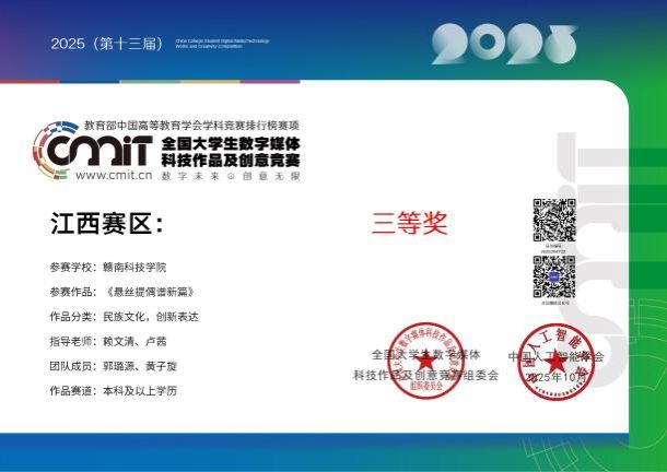 近年来,文法学院一直坚持以大学生学科竞赛为抓手,努力拓宽学生获取知识的途径,提升学生应用能力水平。本次大赛文法学院精心组织,选派教师悉心指导,取得了优异的成绩。为充分做好本届比赛的参赛工作,我院由数字媒体艺术专业教研室主办,先举行了校内赛,共收到来自全院80余件参赛作品。教研室组织相关专业老师进行了细致的赛事介绍和技术辅导工作,认真遴选出了8件作品进入江西省赛,省赛中选出了3支优秀队伍进入2025年(第13届)全国大学生数字媒体科技作品及创意竞赛全国总决赛。