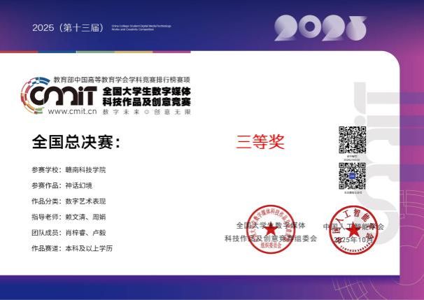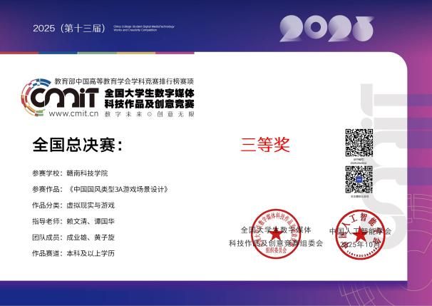 本网讯:今日,“2025年(第13届)全国大学生数字媒体科技作品及创意竞赛”全国总决赛在哈尔滨工业大学举行。文法学院赖文清、谭国华两位老师指导的作品《中国国风类型3A游戏场景设计》喜获国家三等奖,参赛学生由数字媒体艺术212班成业雄、数字媒体艺术231班黄子旋两位同学组成;赖文清、邓琦两位老师指导的作品《浮光掠影螺钿数字展馆设计》喜获国家三等奖,参赛学生由数字媒体艺术211班林毓琛、数字媒体艺术232班张鹭两位同学组成;赖文清、周娟两位老师指导的作品《神话幻境》设计作品喜获国家三等奖,参赛学生由数字媒体艺术212班肖梓睿、数字媒体艺术231班卢毅两位同学组成;