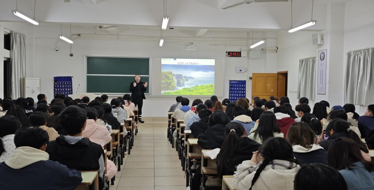 为拓宽学生国际视野,深入了解中西文化,充实跨文化知识,树立文化自信,更好地传播中国文化,2025年11月25日文法学院邀请在本学期邀请了赣南师范大学外教 Donal McNamara在主教Z118教室举办了一场跨文化交际讲座。讲座以当今世界和平发展主题为核心,深入剖析了跨文化交流的概念、重要性、障碍以及应对措施,并以爱尔兰人文风情为例阐释跨文化交际的内核,吸引了广大师生参与,全场座无虚席。