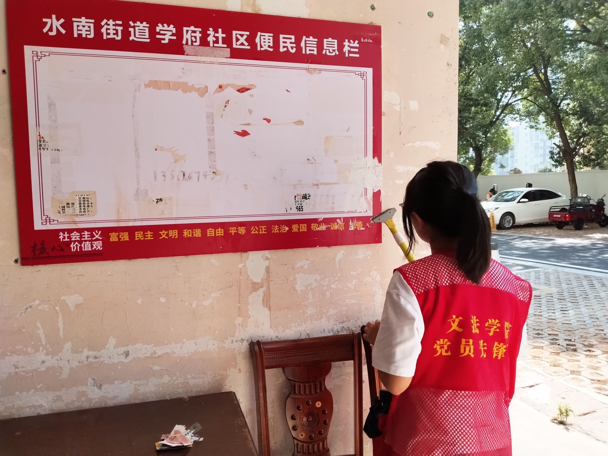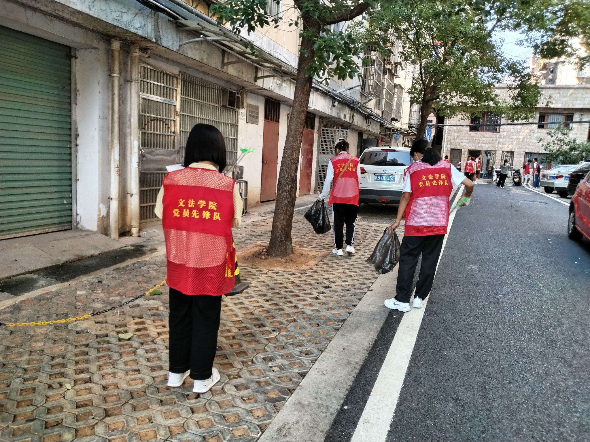 志愿者们的身影活跃在小区的各个角落——有的仔细清扫路面堆积的落叶,有的耐心捡拾绿化带中的塑料瓶、纸屑等白色垃圾,有的合力清除楼道内胡乱张贴的小广告,还有的将乱停乱放的电动车逐一归位,摆放整齐。大家分工明确,配合默契,充分展现了文法学子不怕脏、不怕累的优良作风和服务社会的青春担当。