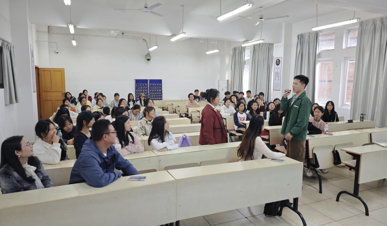 2025年11月14日下午16:00,文法学院在主楼117教室举办优秀校友职业发展规划讲座,旨在破解大学生职业迷茫,帮助其明晰专业价值与发展路径,为大学阶段的学业规划与能力提升树立方向。本次讲座由对外交流与合作处涂敏主任主持,特邀跨界发展多年的优秀校友英语052班凌青以及英语202班冯涛主讲,英语教研室负责人顾玲、英语052班班主任谢霞和英语202班班主任范丽萍,以及学院2025级、2024级、2023级英语专业学生到场聆听。